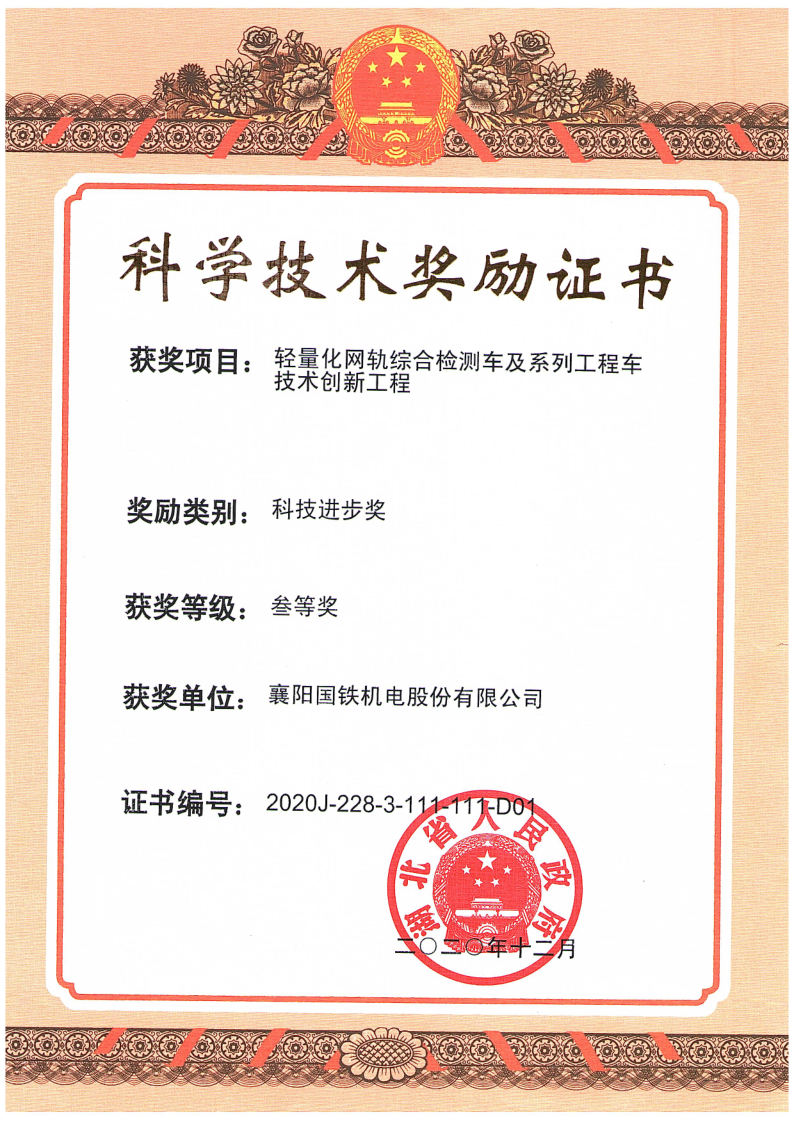 湖北省科技進步三等獎 輕量化網軌綜合檢測車及系列工程車技術創新工程