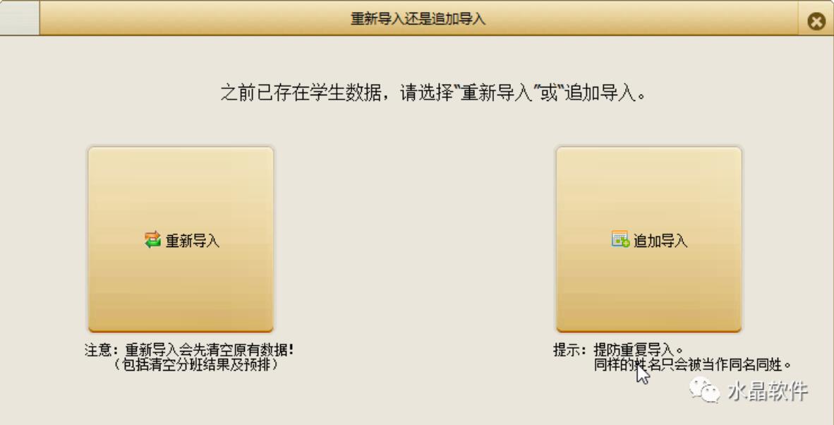 答:如果水晶分班中已經有學生數(shù)據(jù),再點導入學生時,會出現(xiàn)“重新導入”和“追加導入”兩個選擇(如下圖)。“重新導入”會先清空原來水晶分班中所有學生信息后再導入;“追加導入”就是用來補充追加學生的(但要提防重復導入)。