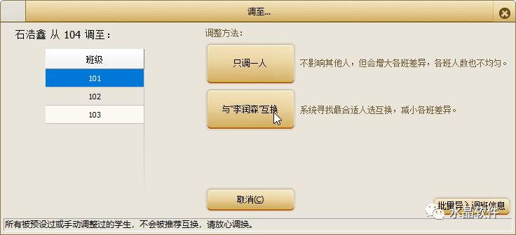 答:在“選擇模式”下(看第6個問題圖片),雙擊該學生,然后選擇要調到哪一班就行了。可以選“只調一人”,也可以由系統(tǒng)自動推薦一個人與其互調。(請放心調整,有預設和手工主動調整過的學生,都不會被系統(tǒng)自動互調)