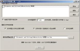 重復(fù)文件查找工具,可以查找出一個(gè)或多個(gè)目錄(及其子目錄)下的(文件名相同或不同)類型、內(nèi)容(功能)完全相同的文件。