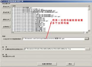 PPT文檔母版批量設(shè)置工具:批量為Microsoft PowerPoint幻燈片文檔設(shè)置母版。 操作簡(jiǎn)單:您只需為一個(gè)PPT文檔設(shè)置母版,然后在本工具中將其選擇為復(fù)制模板,就可以批量為多個(gè)PPT文檔一次性設(shè)置母版。